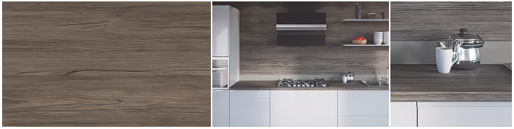 This egger worktop has a deeply brushed surface that creates the look of sand-blasted timber. The in-vogue grey colour makes this a particularly modern choice which suits combinations with neutral solid colours, including light or dark grey. Matching splashback was chosen by this Baillieston customer as well.