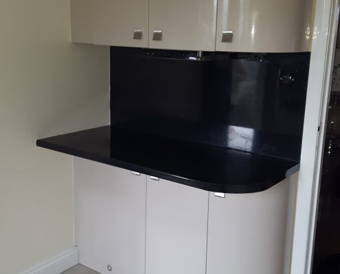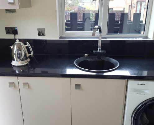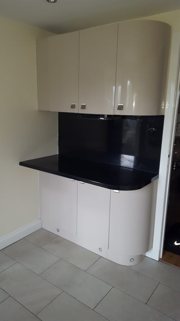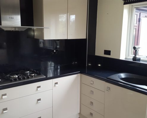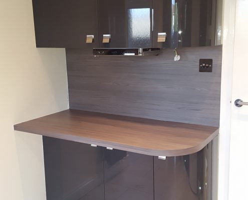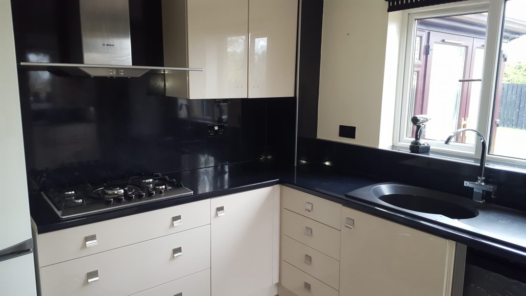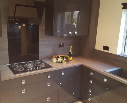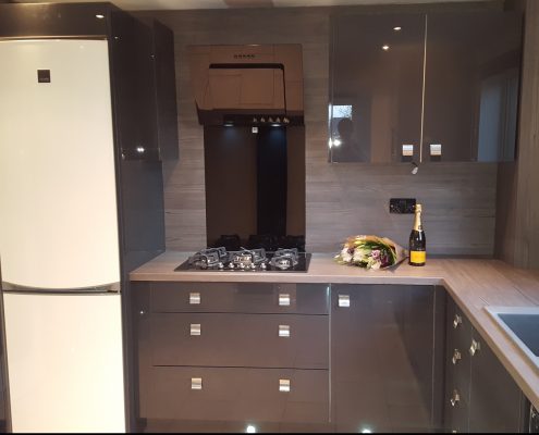 These customers from Baillieston decided to go for a darker door colour. This high gloss finish would give a sophisticated and bold look to any kitchen. Whether you combine it with lighter or darker worktop, gloss graphite will make your kitchen to stand out.